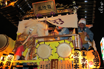 Sur la plateforme du premier étage, un petit orchestre traditionnel, ou Hayashi joue de la flûte, du tambour ou de la clochette. L’un d’entre eux porte un masque et s’agite, danse au son de la mélodie. Lorsque plusieurs chars se rencontrent à un croisement et se font face, commence alors ce que l’on appelle le Hikkawase. Moment durant lequel les chars rivalisent et s’affrontent au cœur d’une joute musicale. Il est alors impressionnant de constater la ferveur qui anime tous les participants.